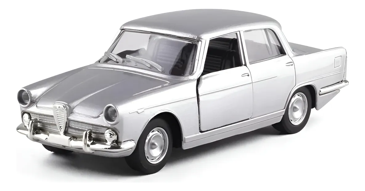 Diferenciais: Réplica fiel da grade frontal em “V” característica da Alfa Romeo, para-choques cromados e rodas clássicas com calotas prateadas.