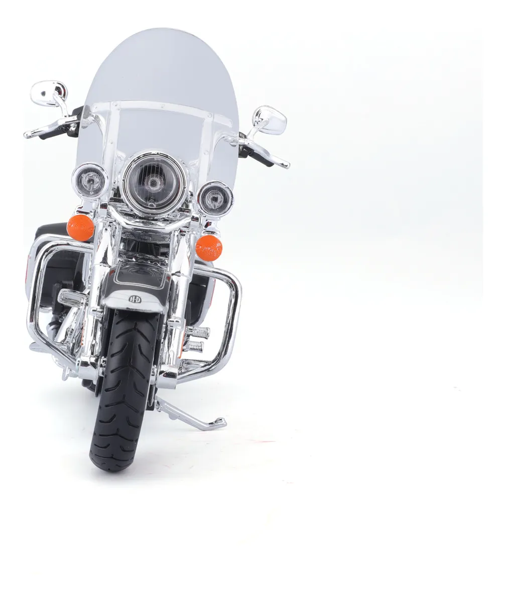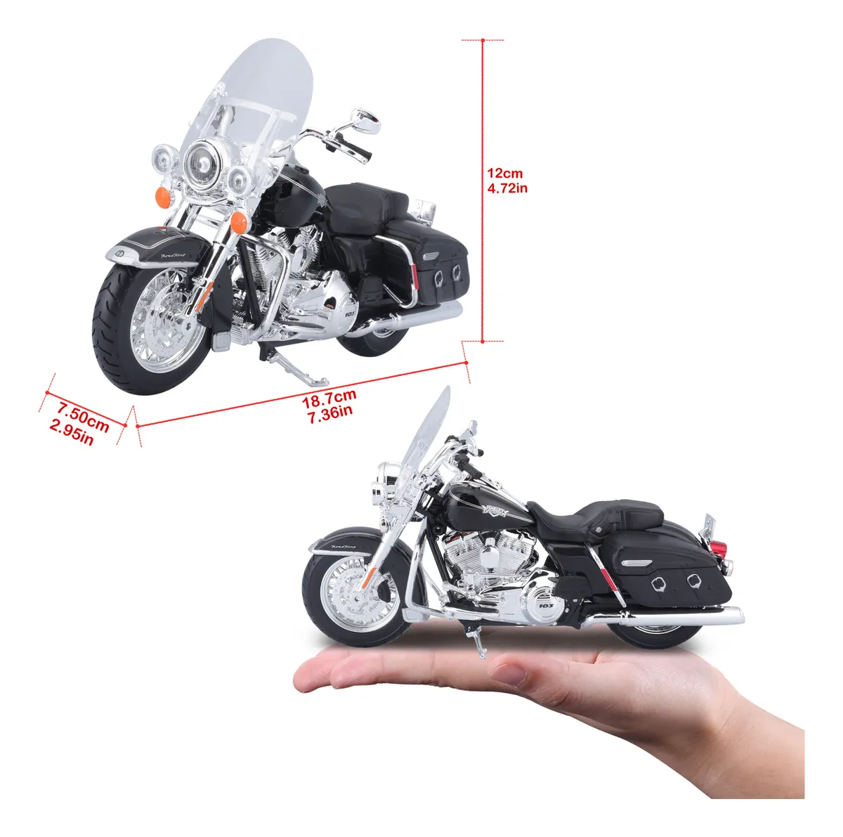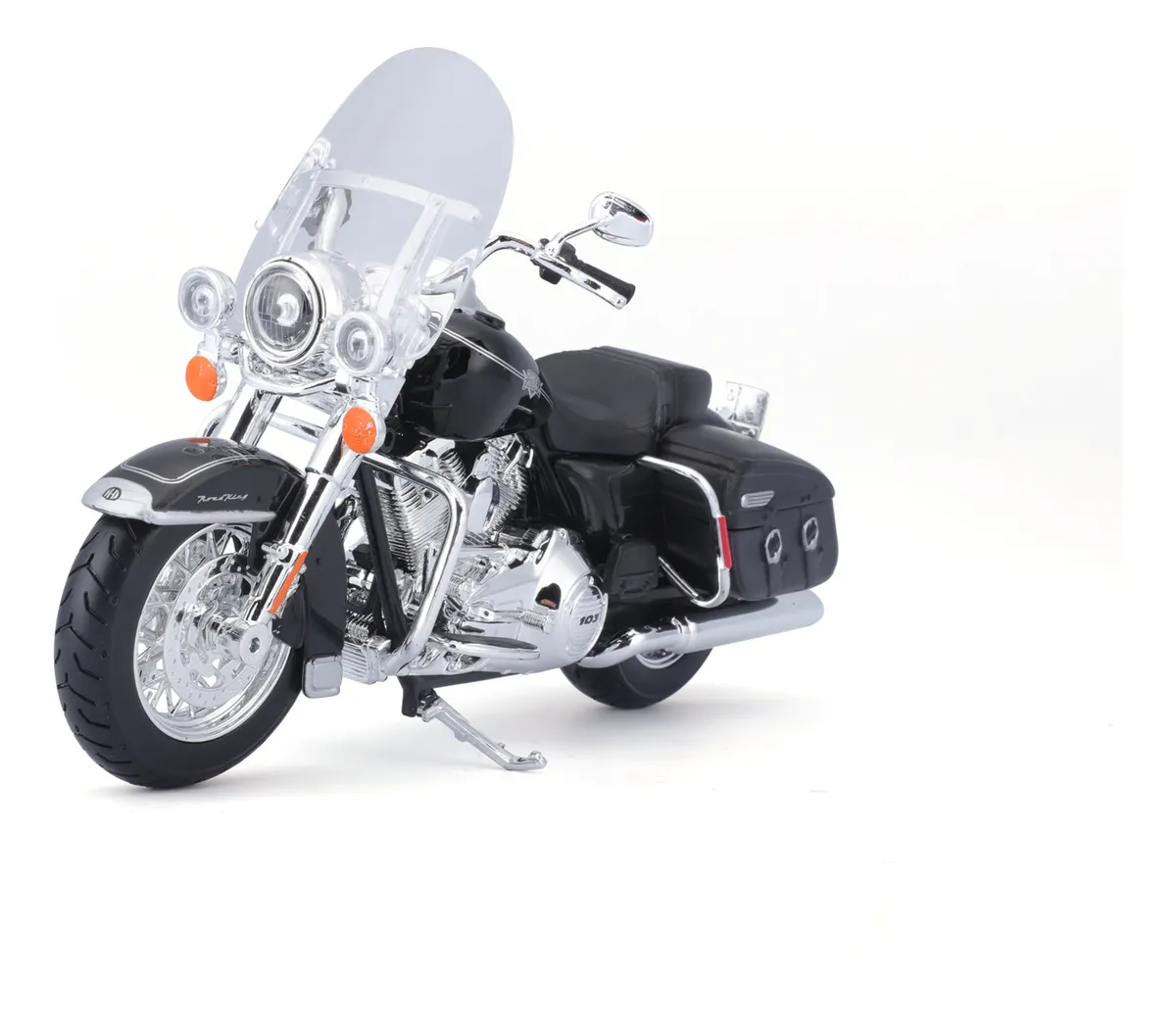 A Harley-Davidson FLHRC Road King Classic de 2013 é uma lenda das estradas, unindo o visual nostálgico das baggers clássicas com a tecnologia moderna da época. Esta miniatura da Maisto na escala 1:12 é uma reprodução fiel e robusta, ideal para colecionadores que apreciam detalhes mecânicos e a presença imponente das motocicletas touring da Harley.