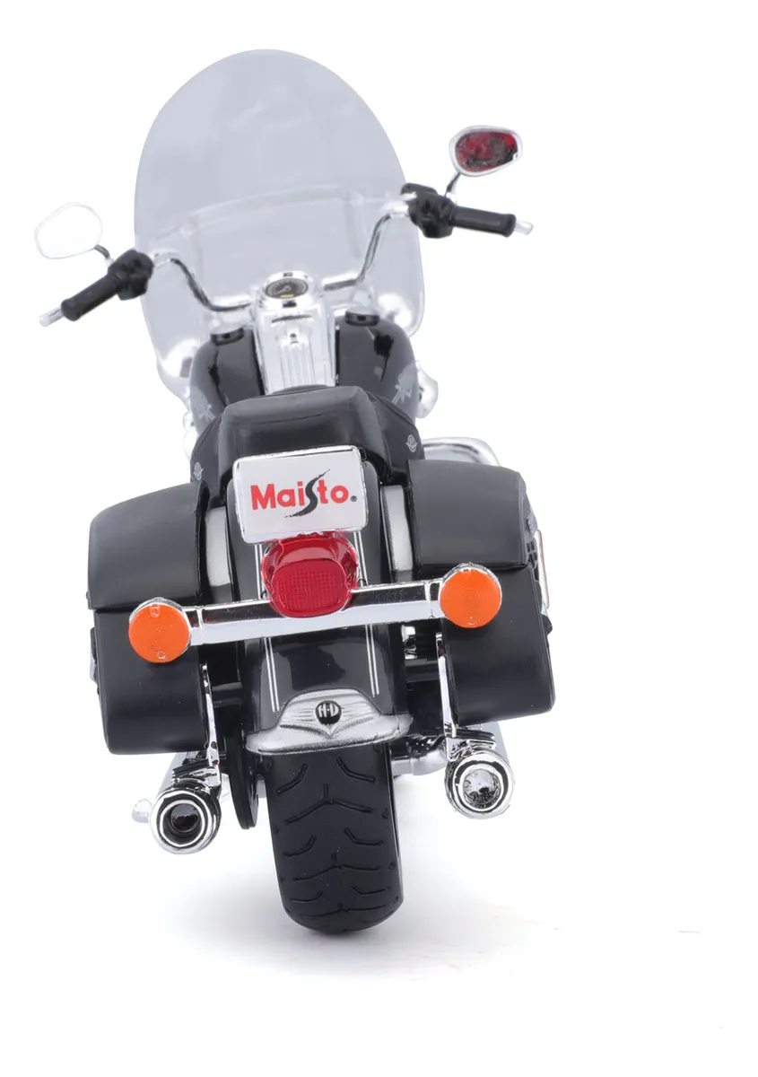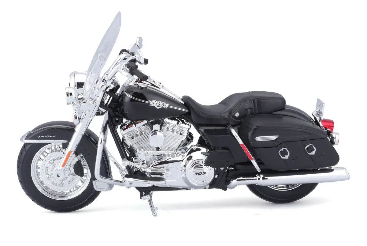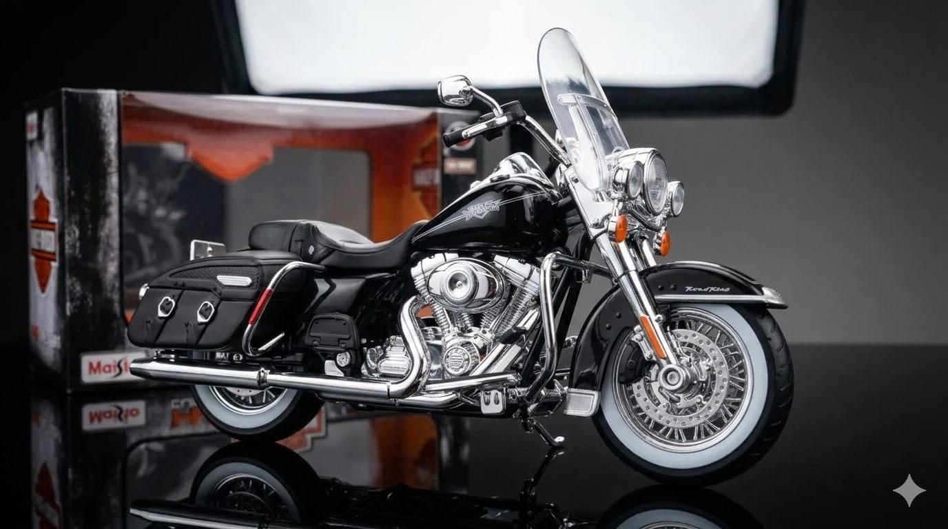 A Harley-Davidson FLHRC Road King Classic de 2013 é uma lenda das estradas, unindo o visual nostálgico das baggers clássicas com a tecnologia moderna da época. Esta miniatura da Maisto na escala 1:12 é uma reprodução fiel e robusta, ideal para colecionadores que apreciam detalhes mecânicos e a presença imponente das motocicletas touring da Harley.